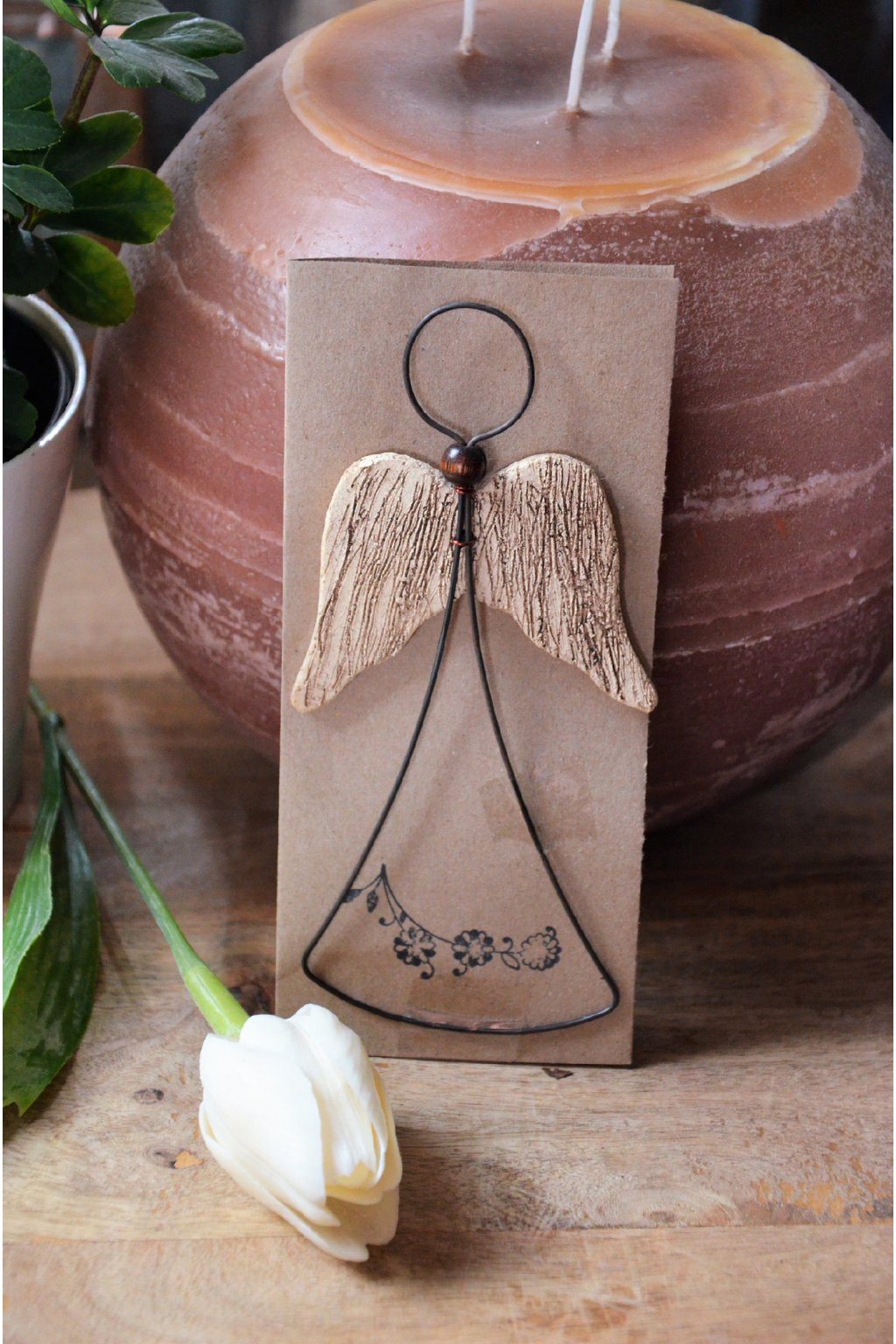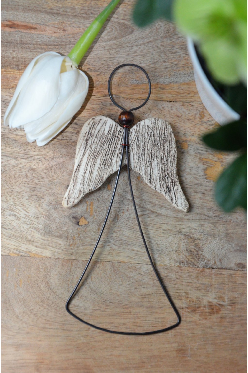 Popis: drátovaný anděl s keramickými křídly na zavěšení.