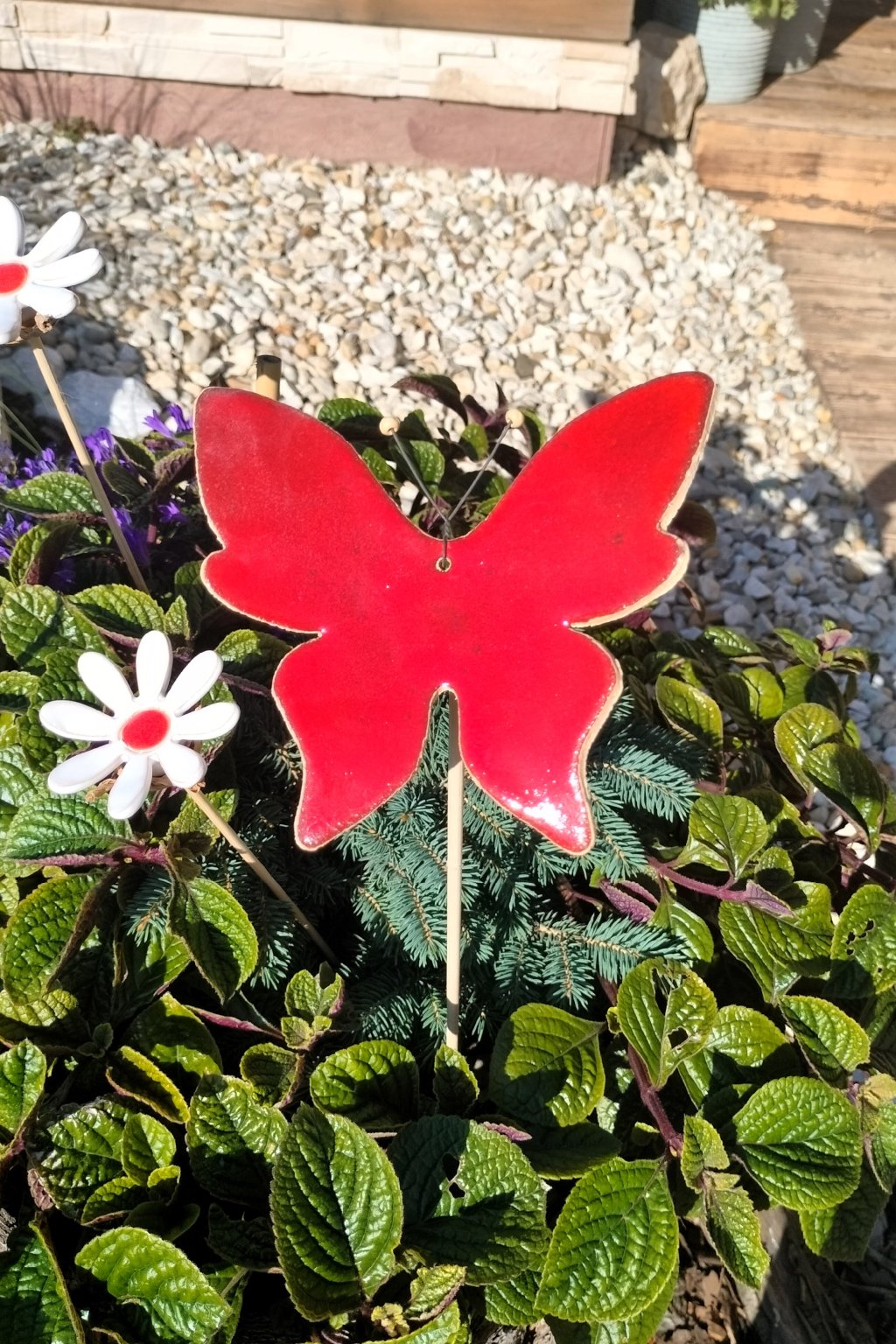 Popis: keramický motýl ve červené čili barvě - zápich - dekorace do velkých váz, zahrad, skalek, na terasu...