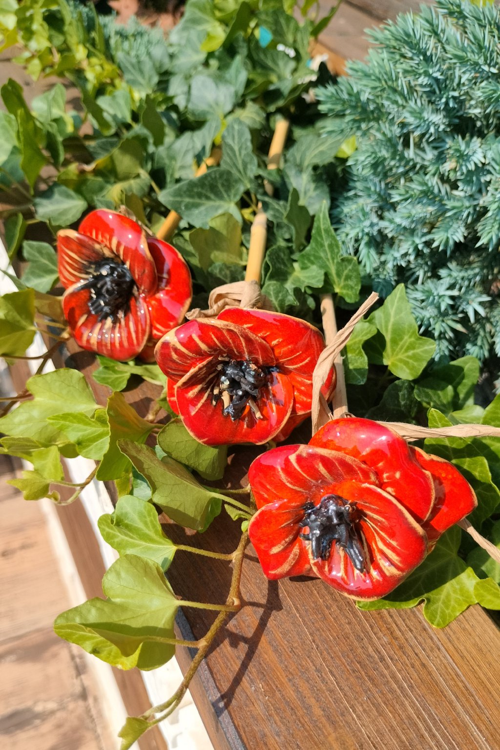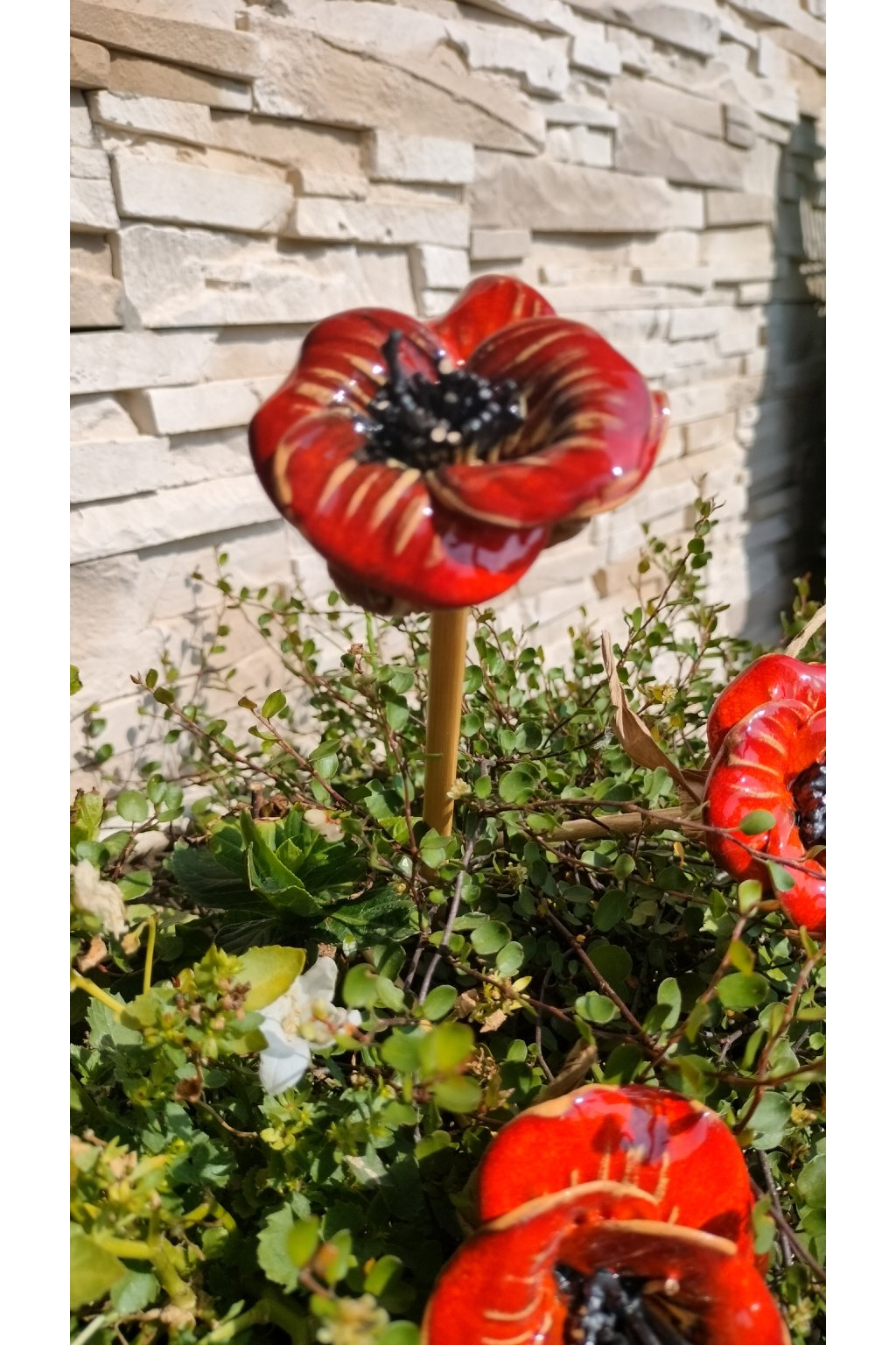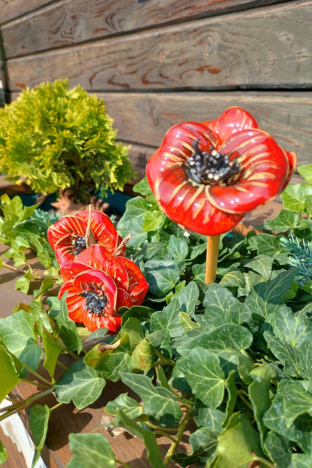 Popis: Keramický mák v červené efektní glazuře - zápich - dekorace do vázy, zahrad, skalek...