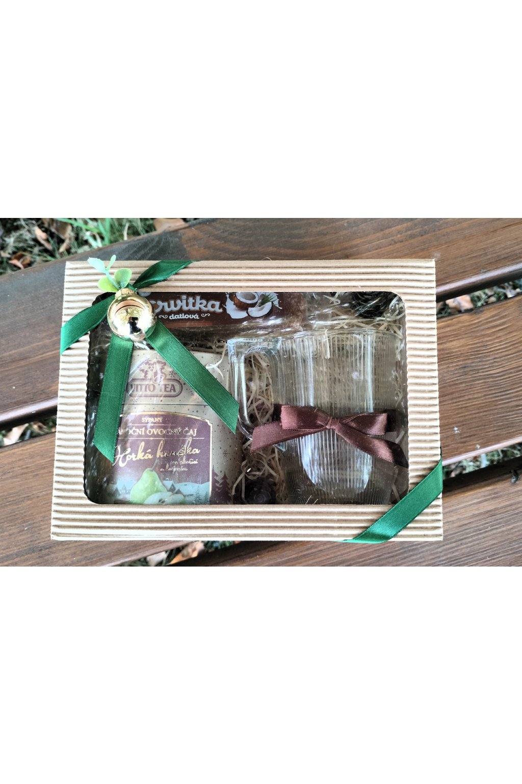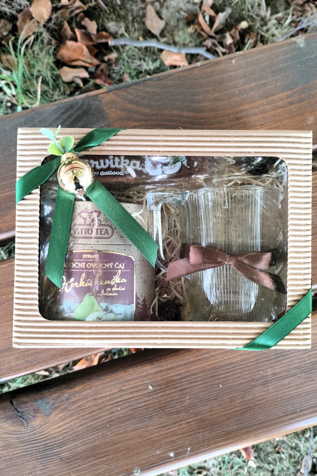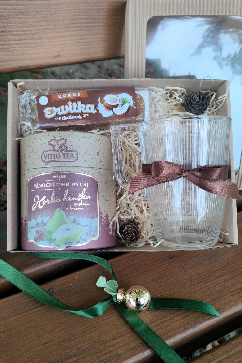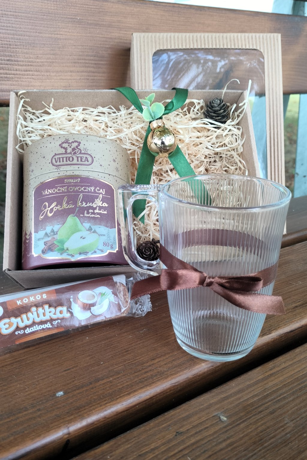 - přírodní krabička s průhledem se stuhou a vánoční ozdobou
