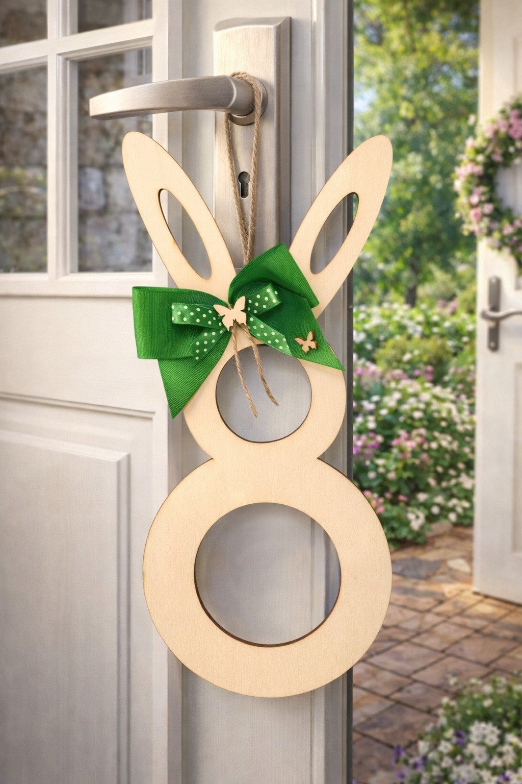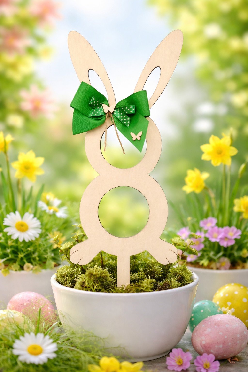🌿 Zajíček na zavěšení nebo zápich do květináče ozdoben zelenou mašlí a dekorativním motýlkem.
