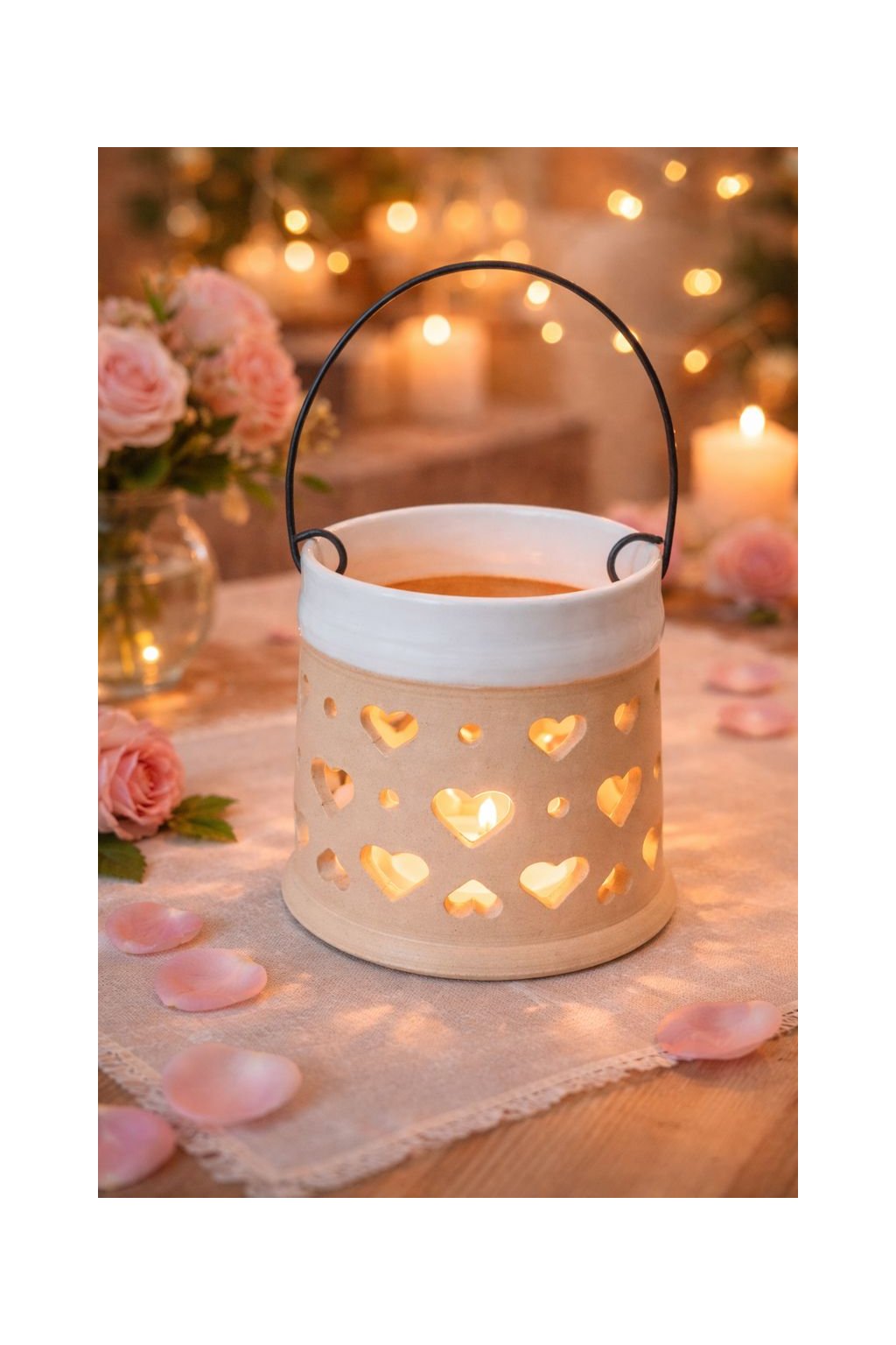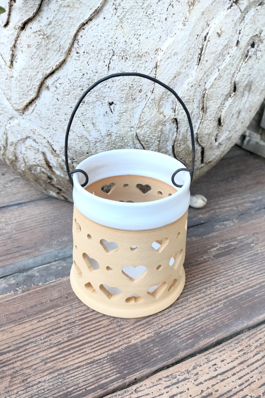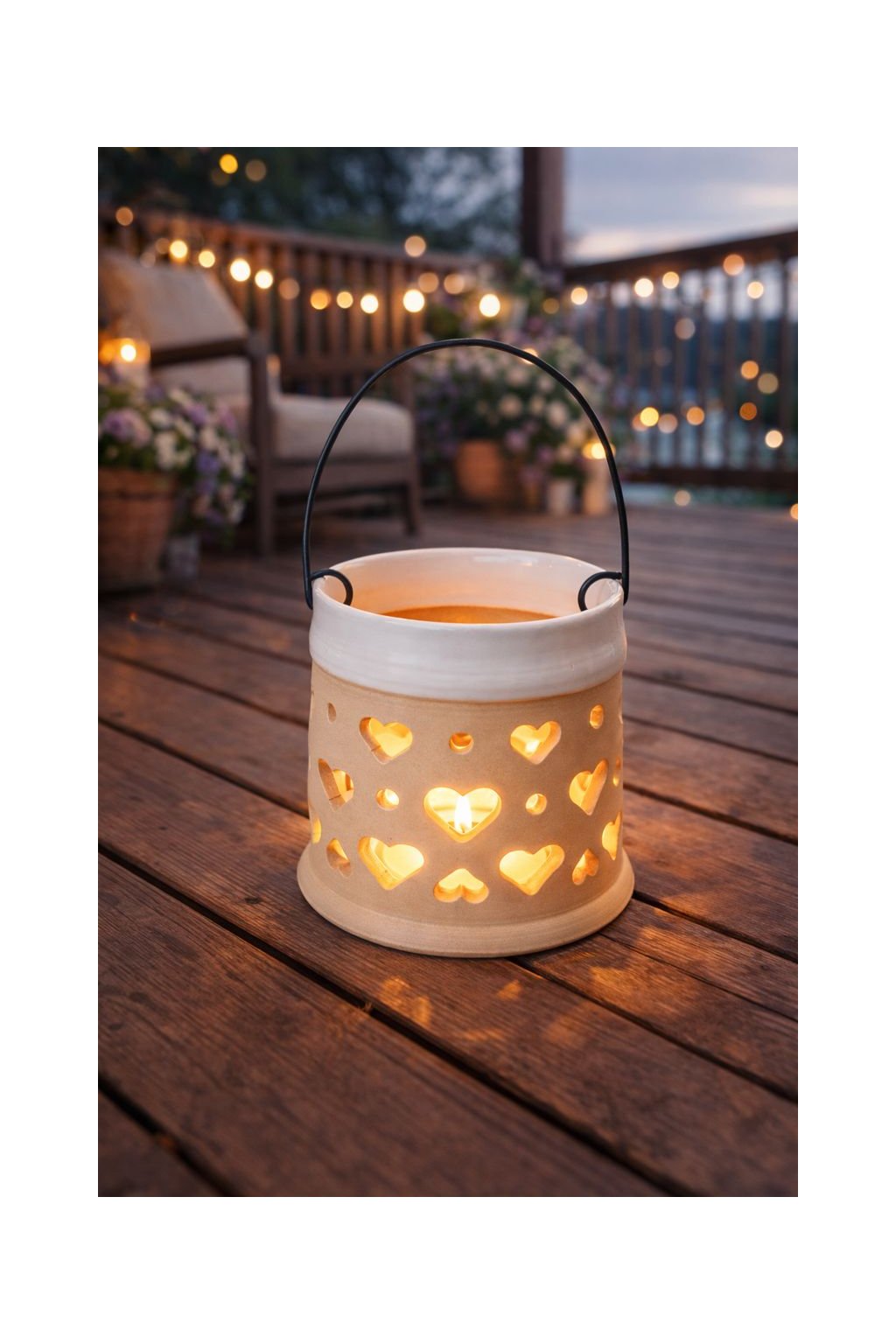 Tato ručně vyráběná keramická lucerna vnese do vašeho domova i na terasu hřejivou atmosféru klidu a romantiky. Jemné výřezy ve tvaru srdcí nechávají světlo svíčky prostupovat ven a vytvářejí měkkou hru světel, která zahřeje nejen prostor, ale i náladu.