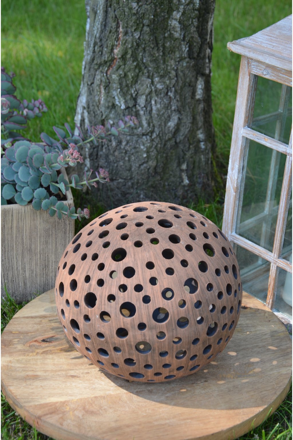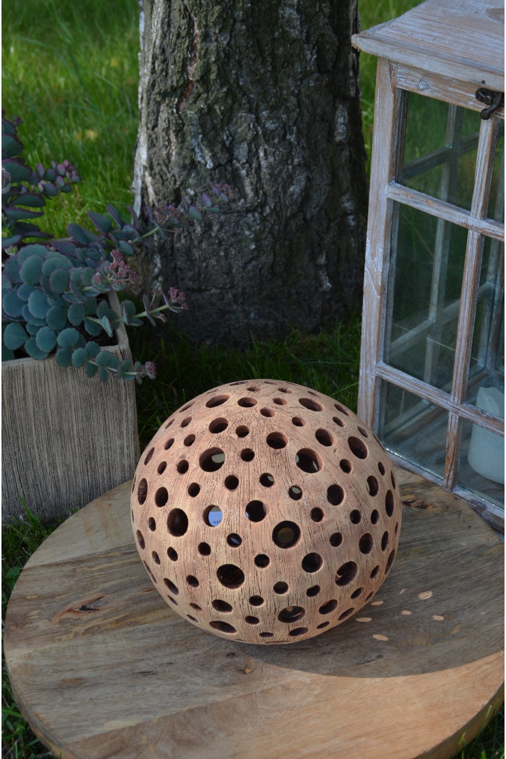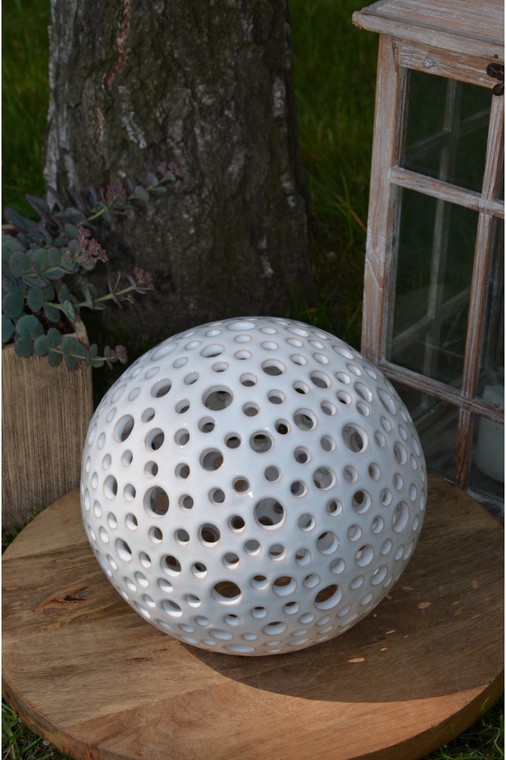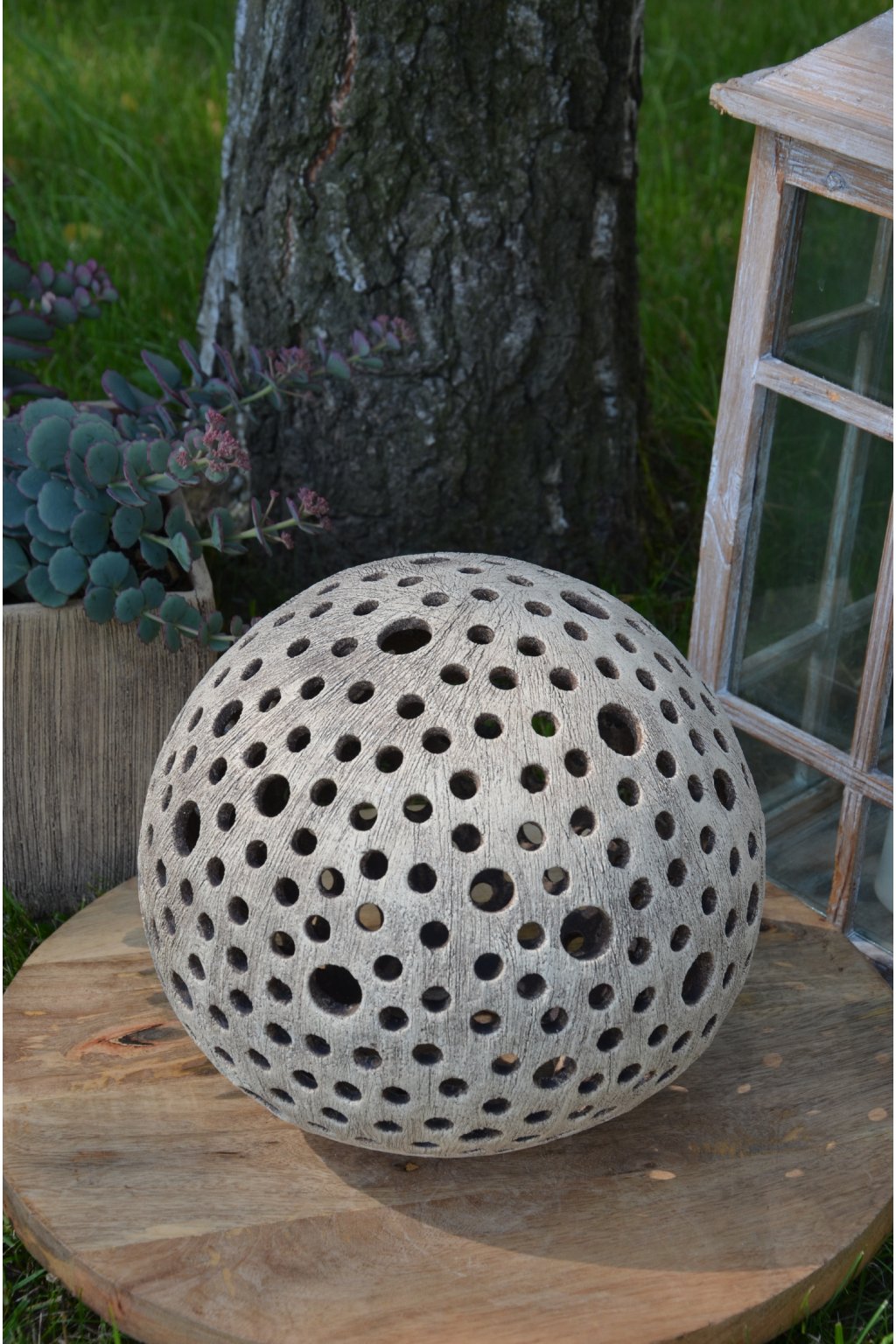 Popis: keramická dekorační koule s motivem kuliček - dekorační svícen do interiéru, zahrad, skalek, na terasu...