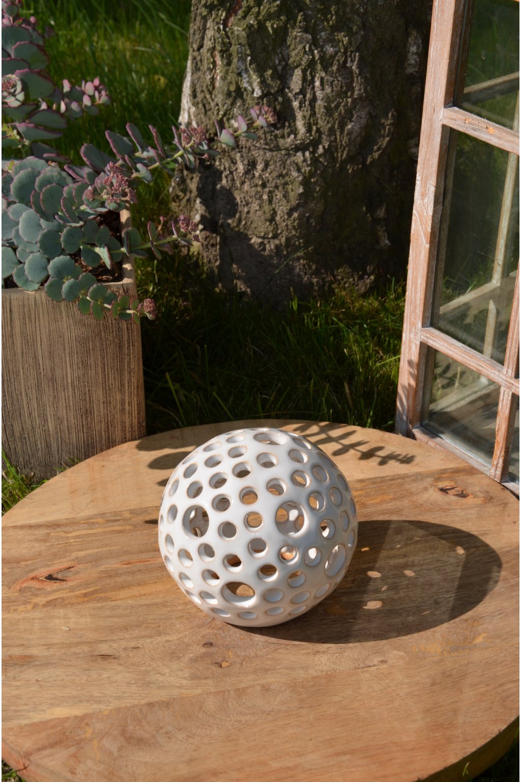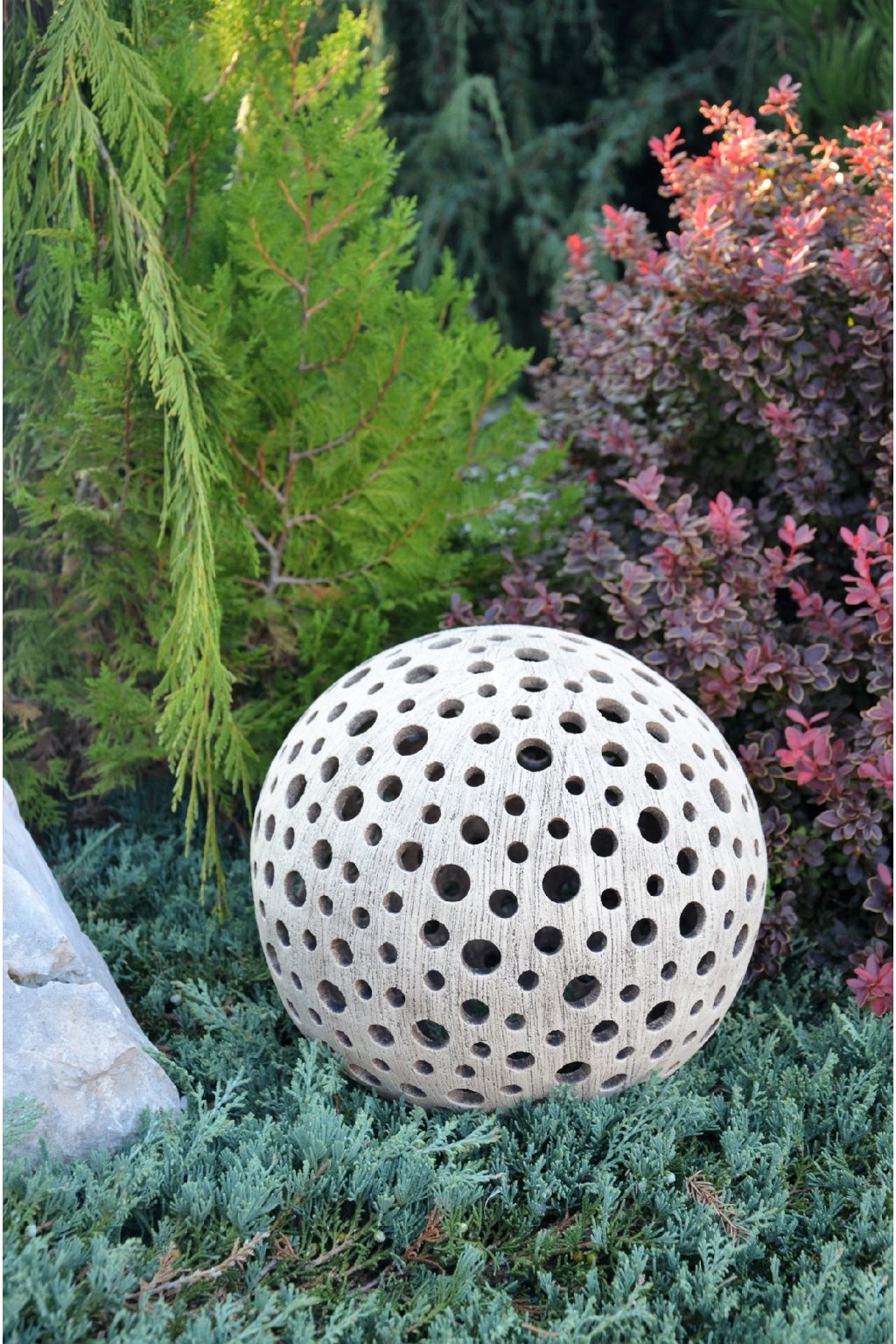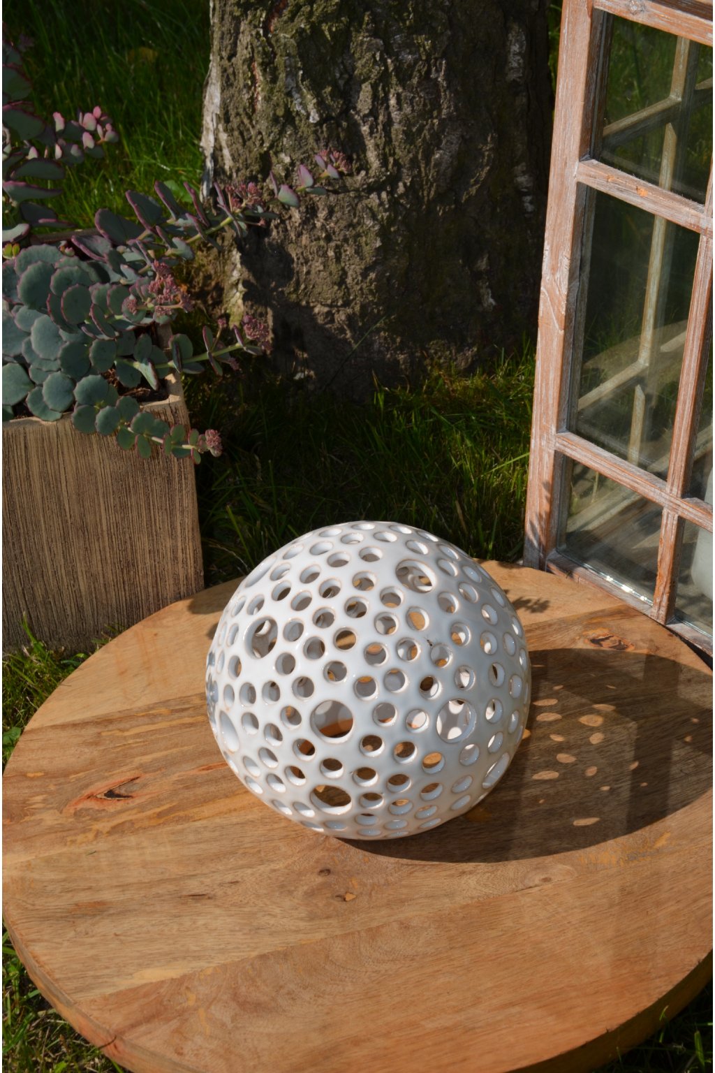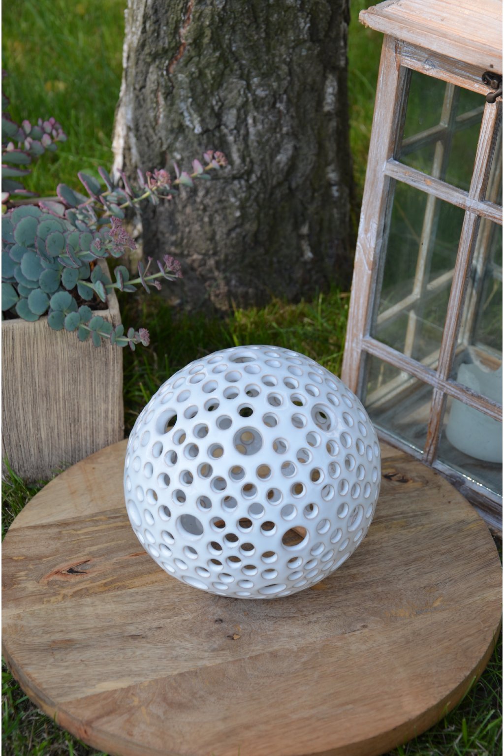 Popis: keramická dekorační koule s motivem kuliček - dekorační svícen do interiéru, zahrad, skalek, na terasu...