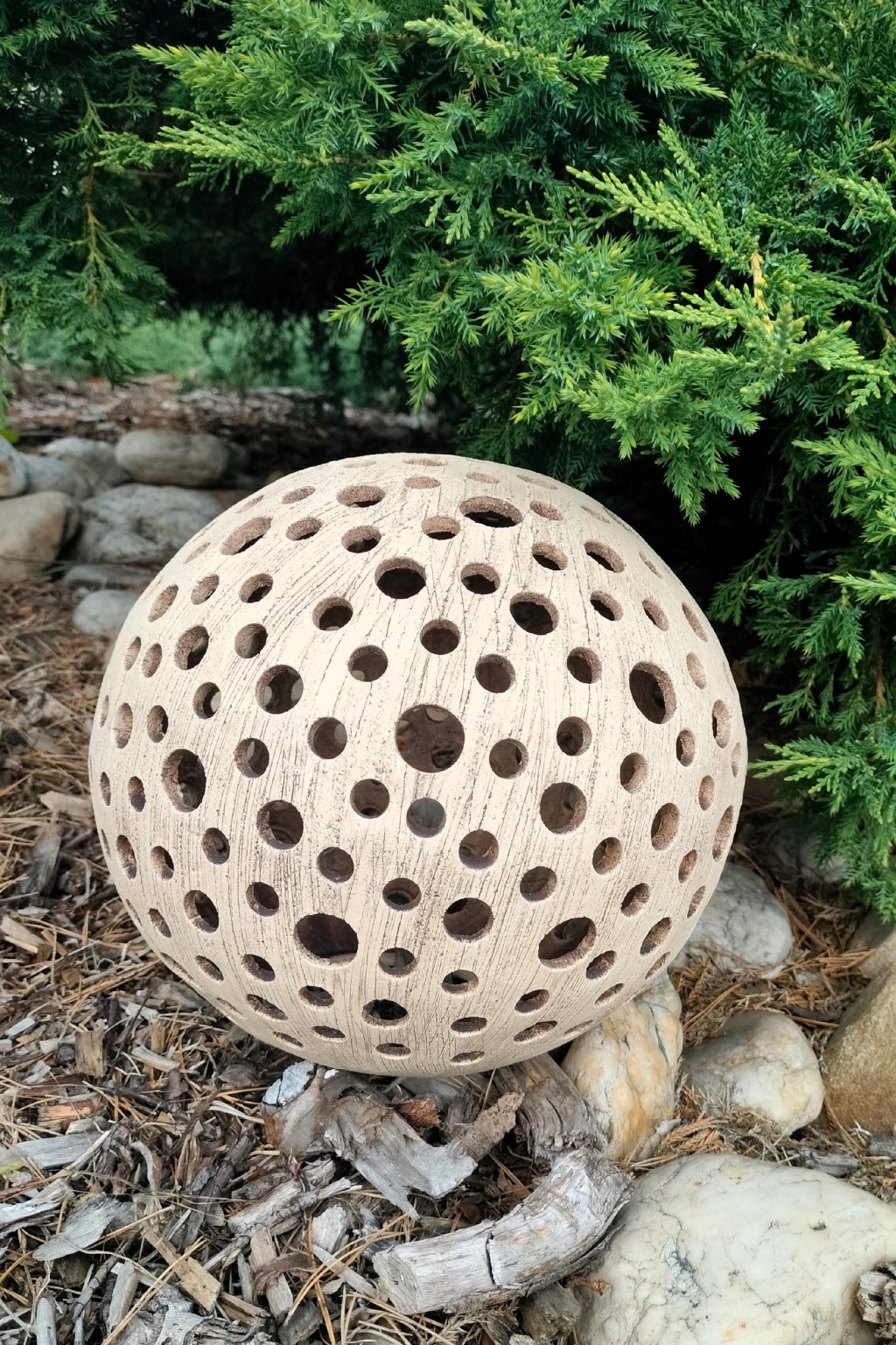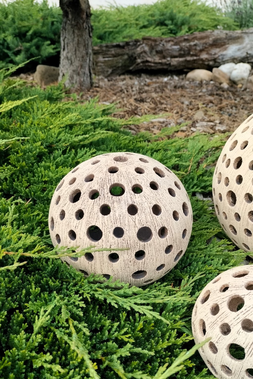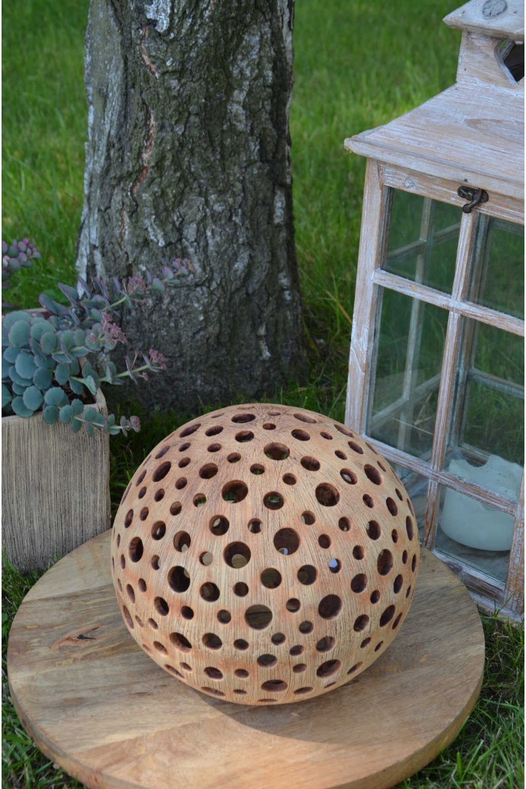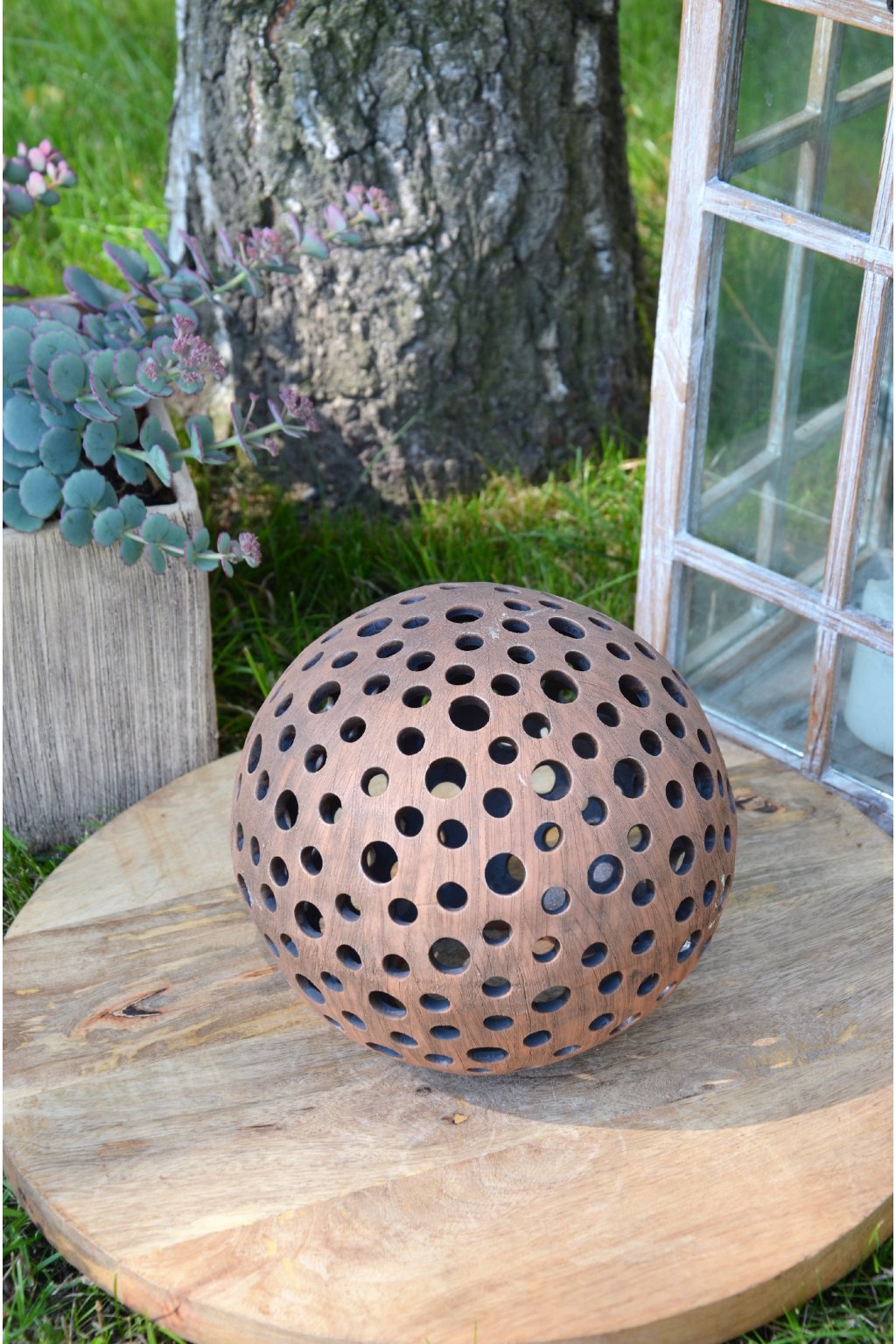 Popis: keramická dekorační koule s motivem kuliček - dekorační svícen do interiéru, zahrad, skalek, na terasu...
