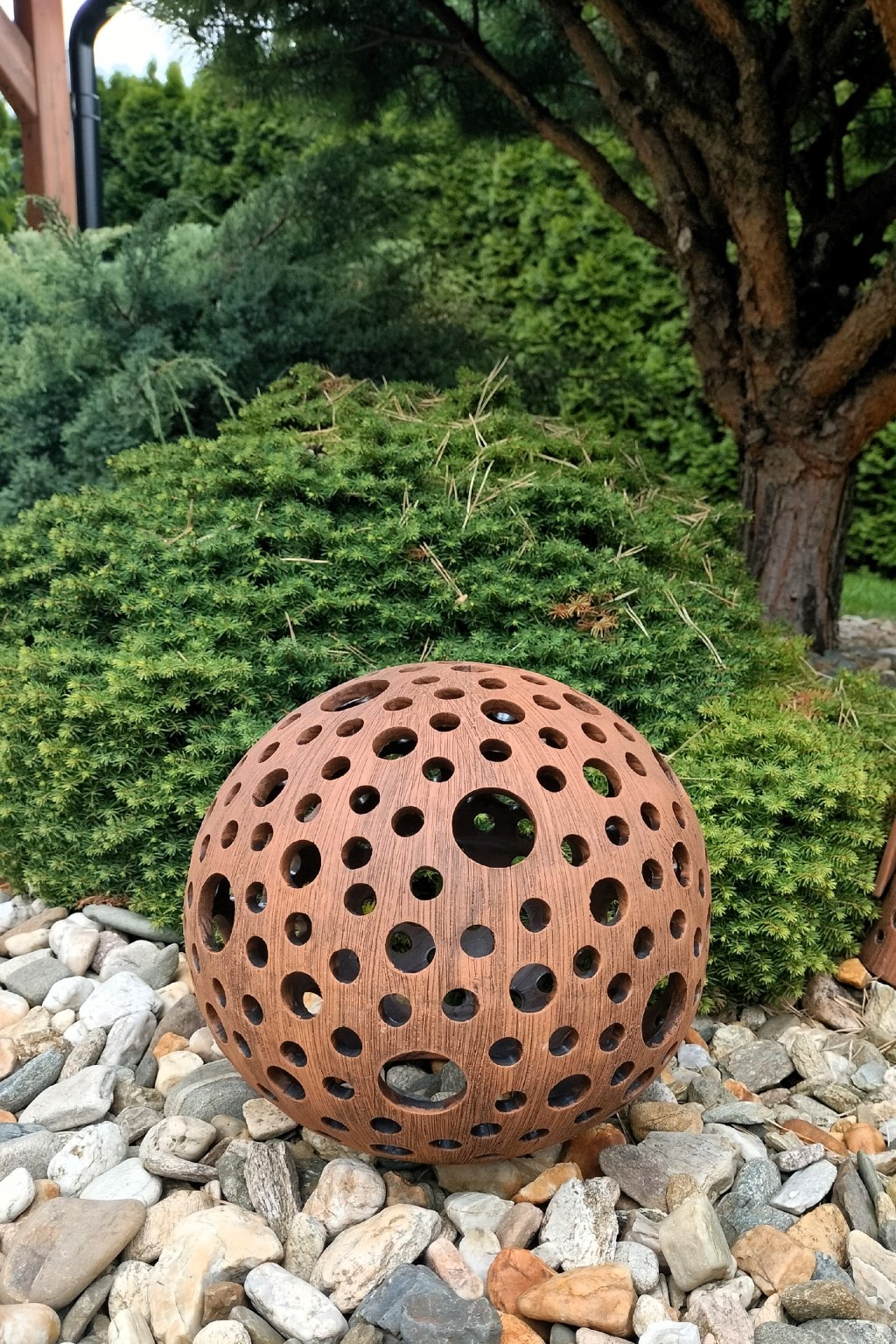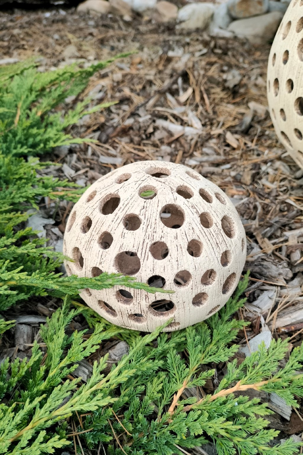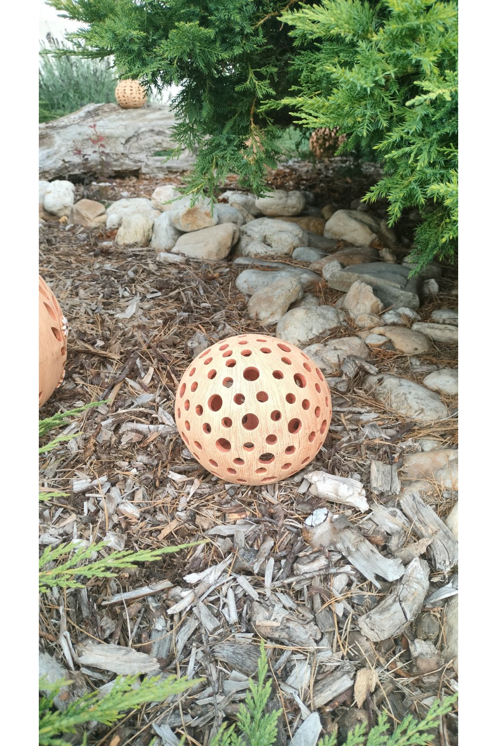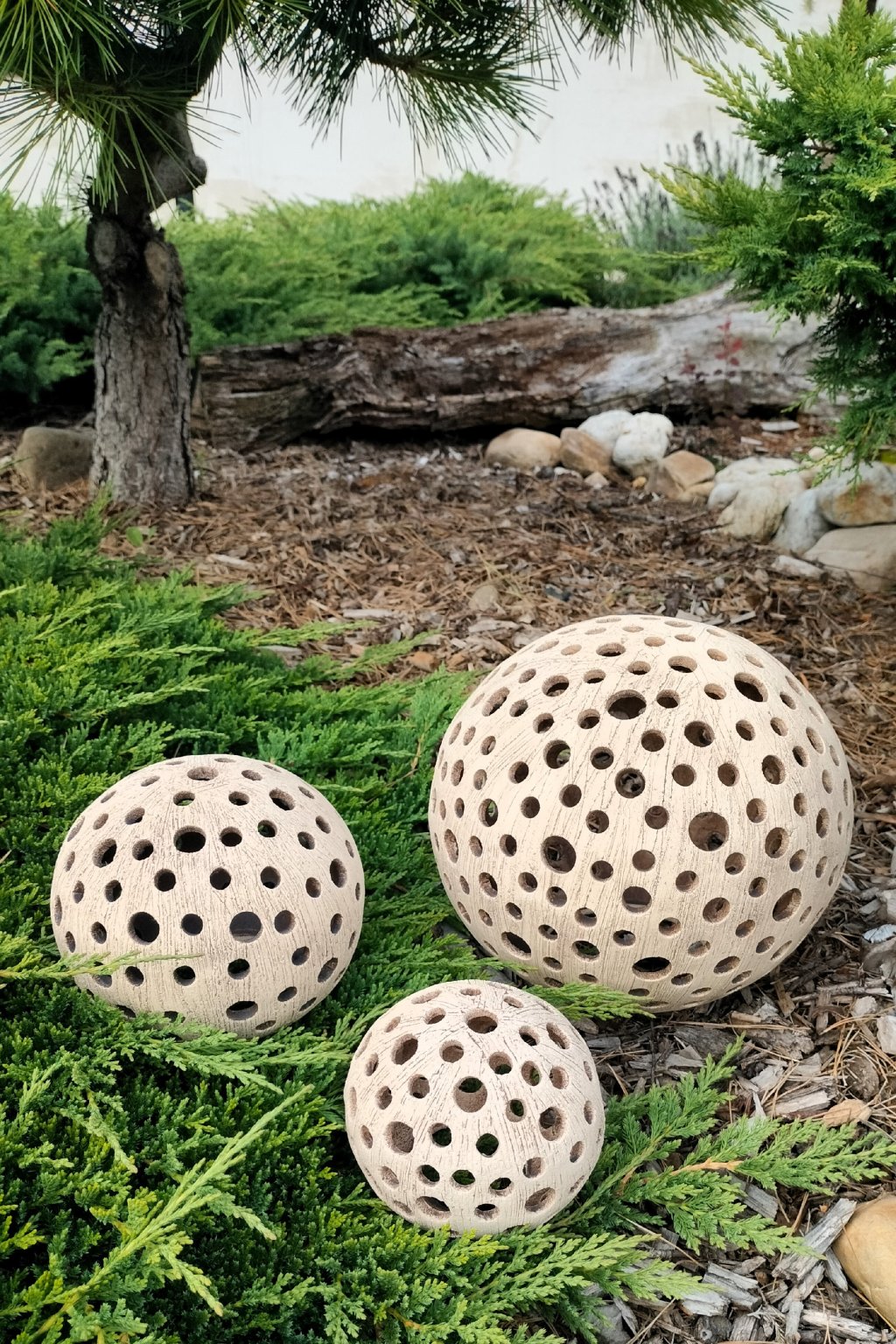Popis: keramická dekorační koule s motivem kuliček - dekorační svícen do interiéru, zahrad, skalek, na terasu...