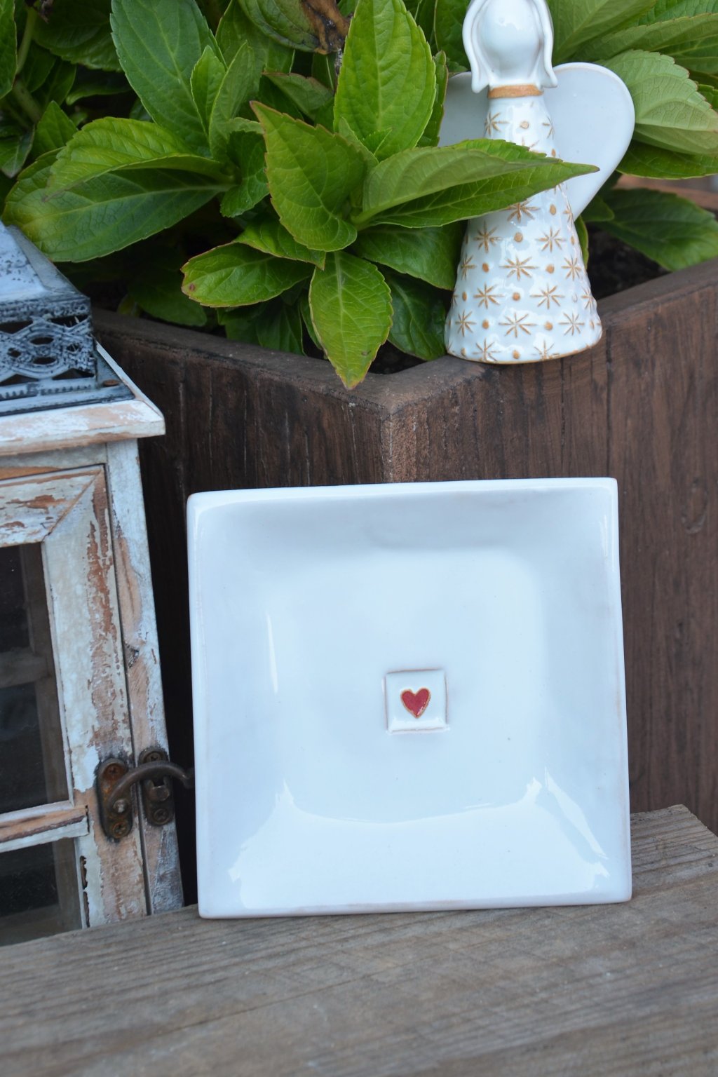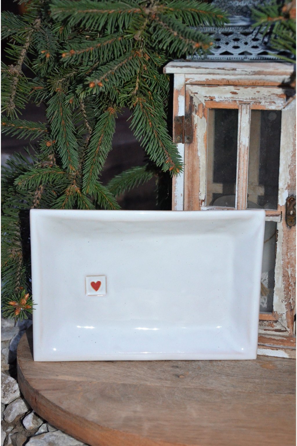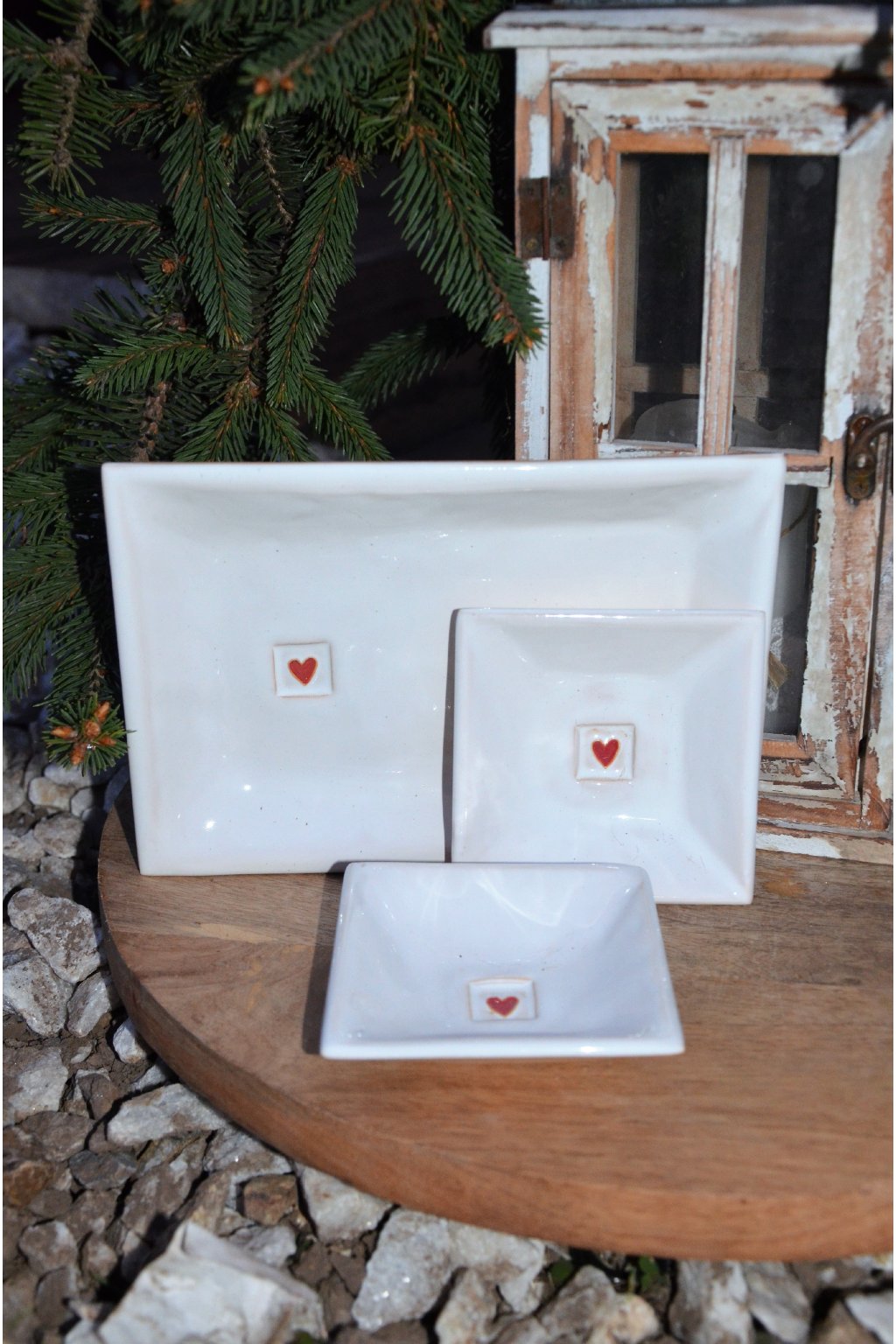 Popis: keramické tácky se vzorem malého červeného srdíčka - vhodné i k servírování potravin.