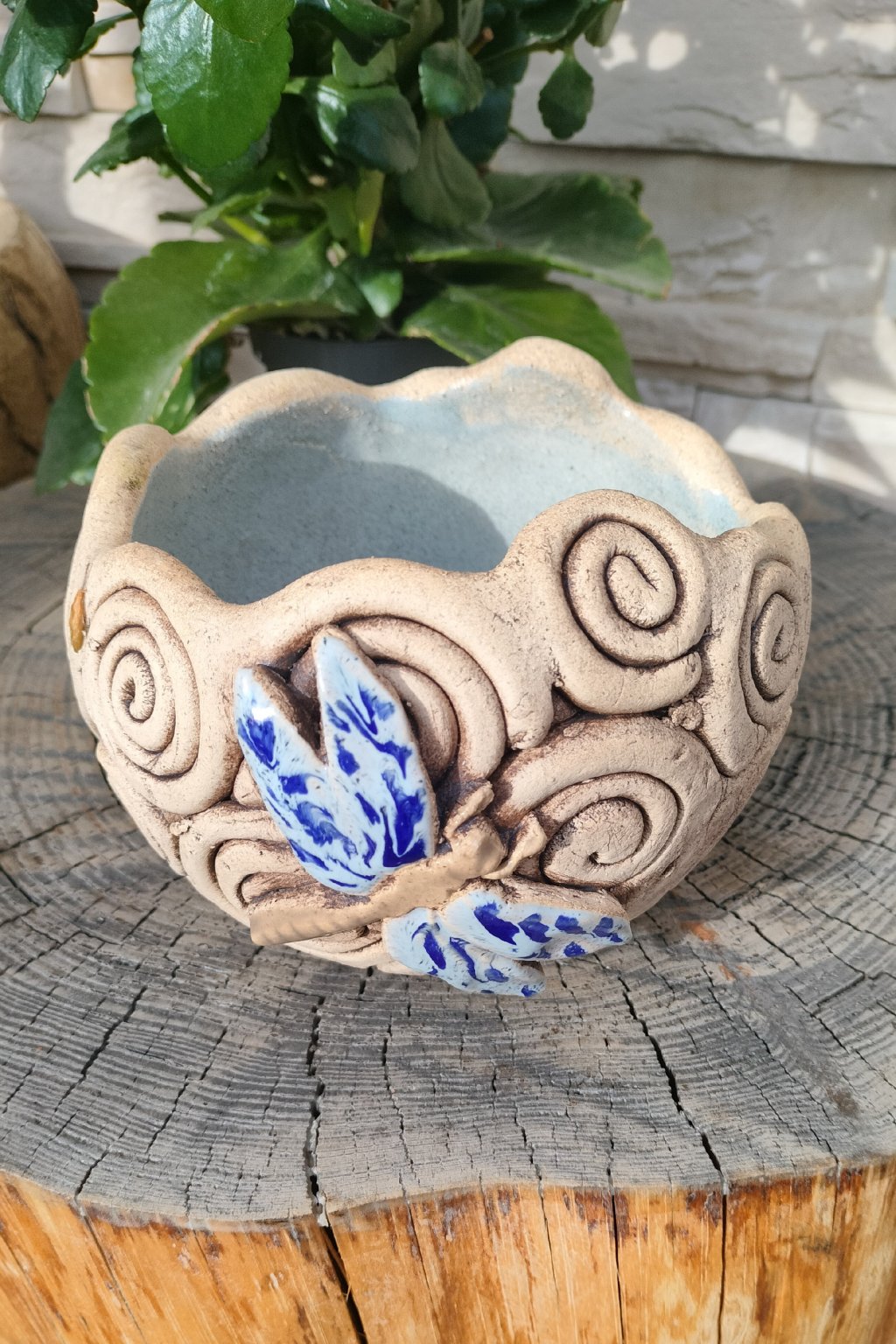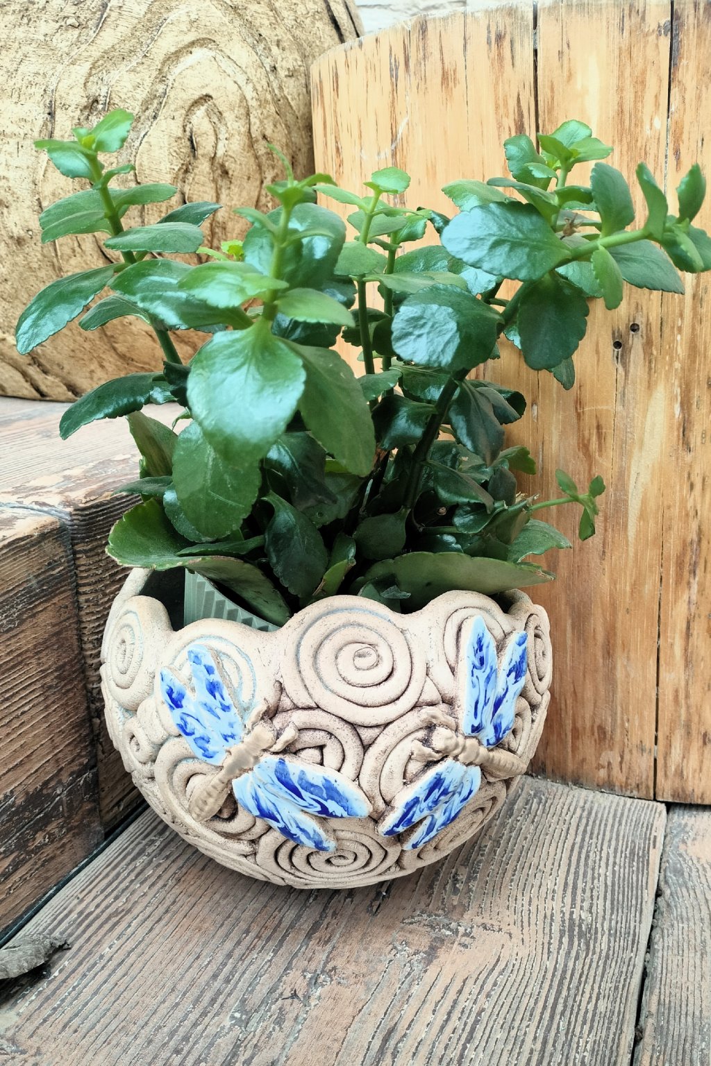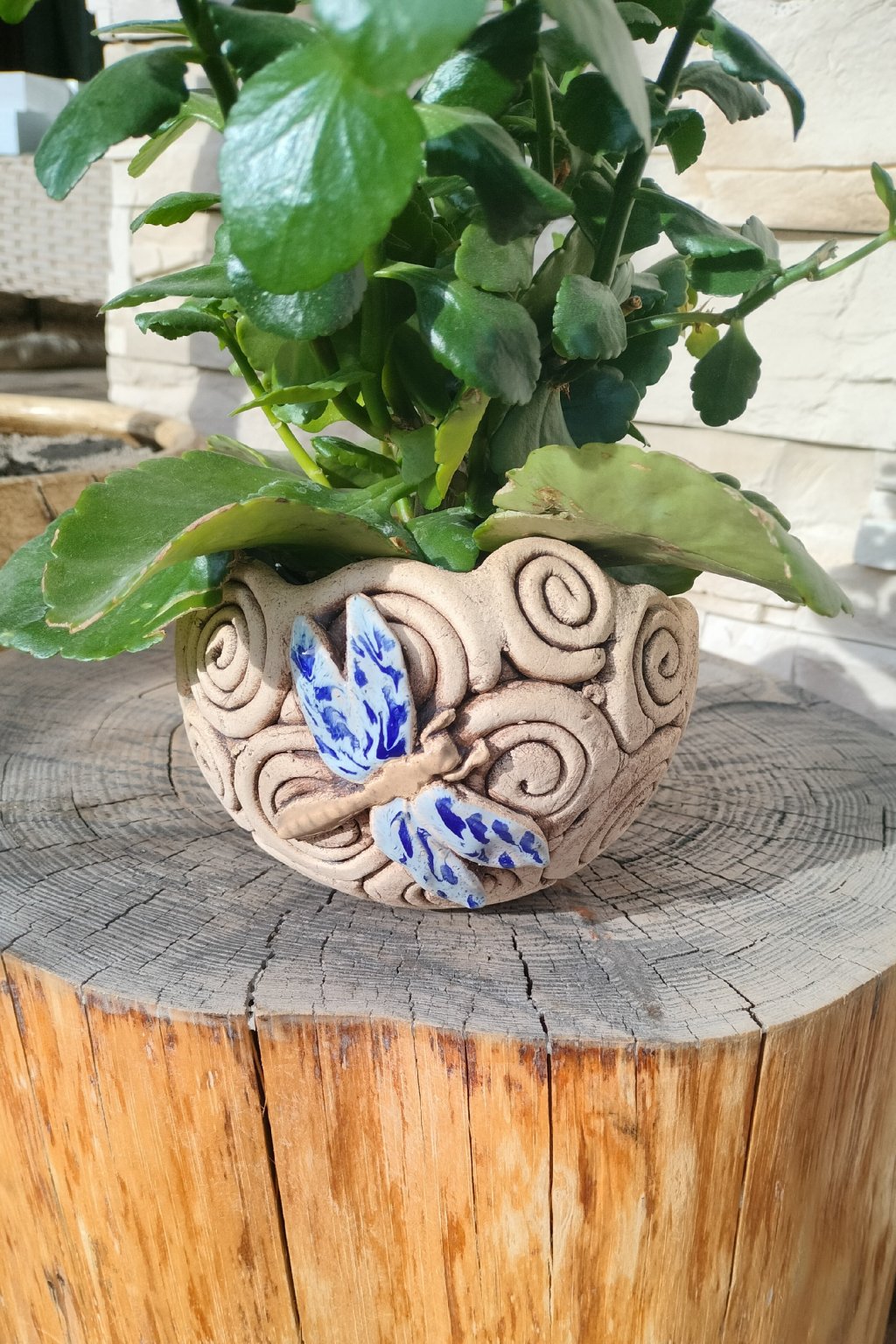 Popis: keramický květináč na sukulenty s aplikací vážky - šnečková technika - práce nevidomých