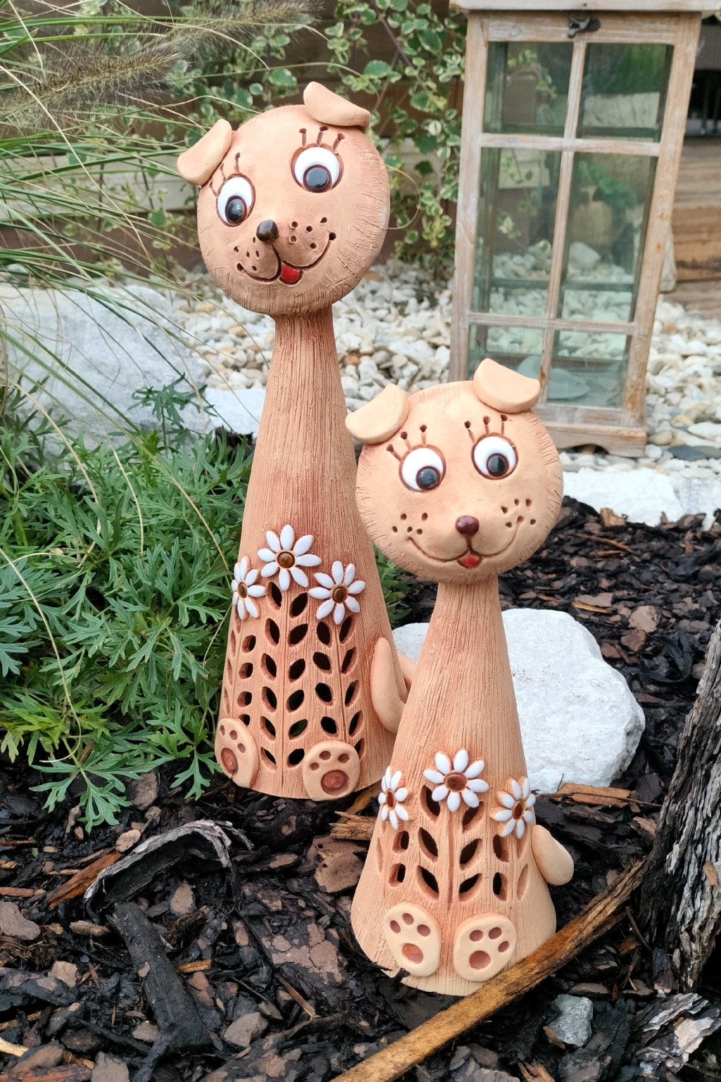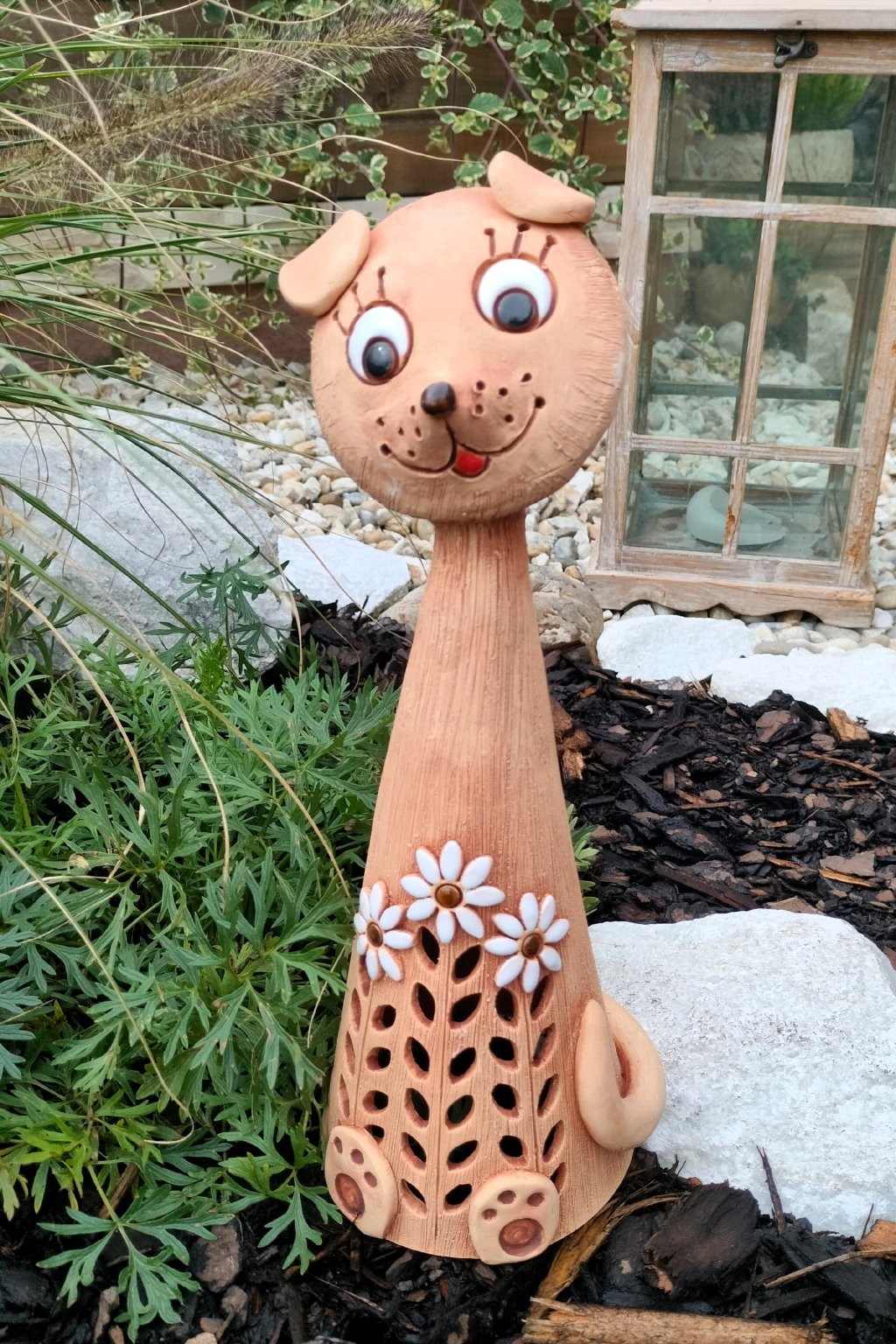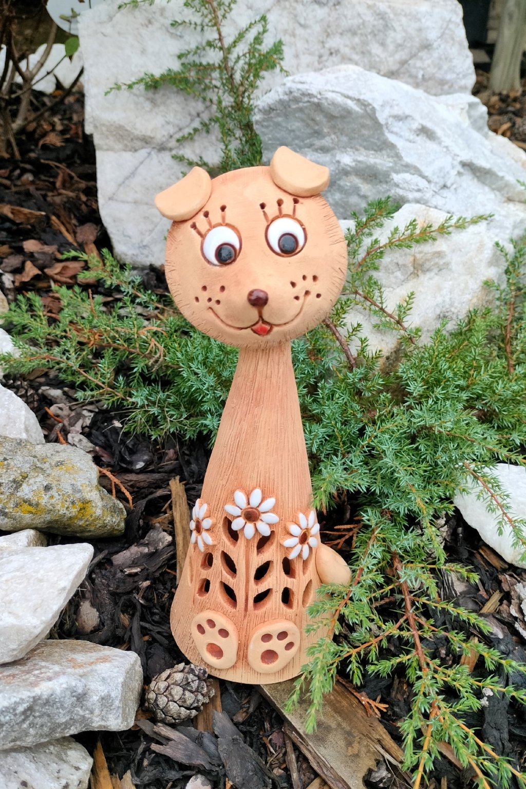 Popis: keramický pejsek s kopretinami - dekorace do interiéru, zahrad, skalek, na terasu...