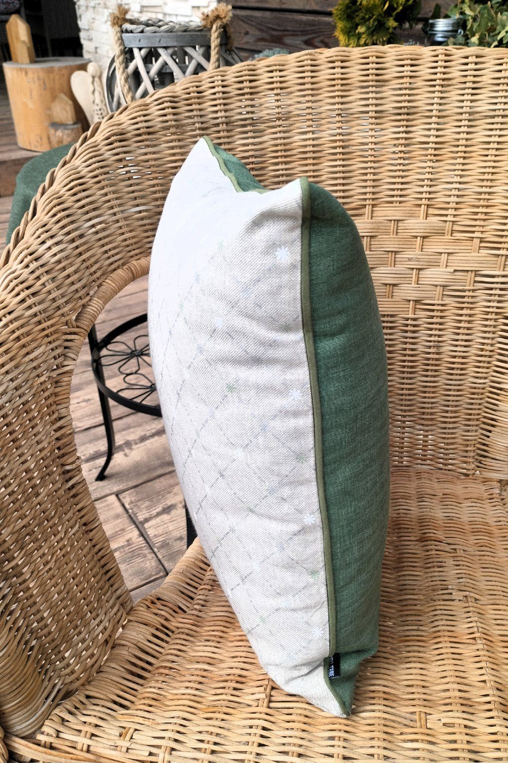 Jemný vzor na režném podkladě, zadní díl v zelené barvě.