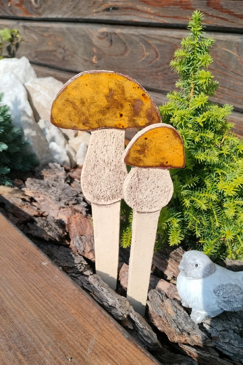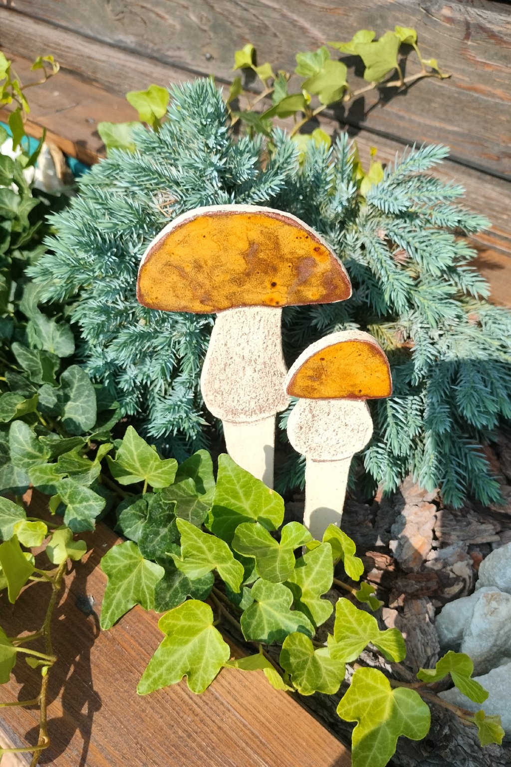 Popis: sada 2 kusů zápichů keramických hřibů - dekorace do zahrad, skalek, květináčů, truhlíků...
