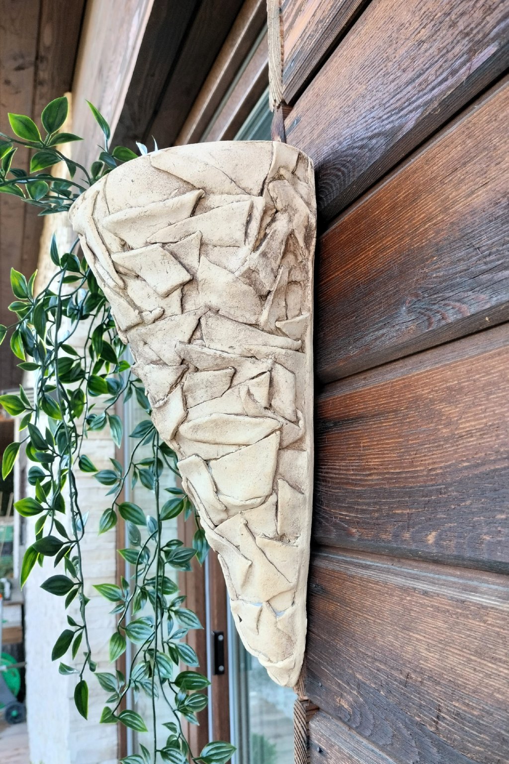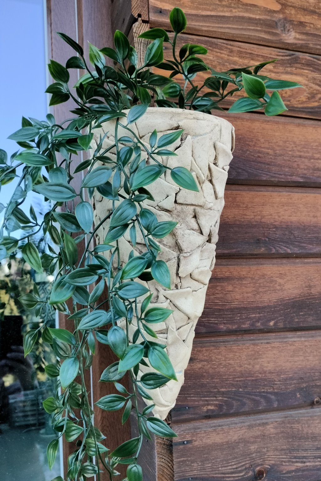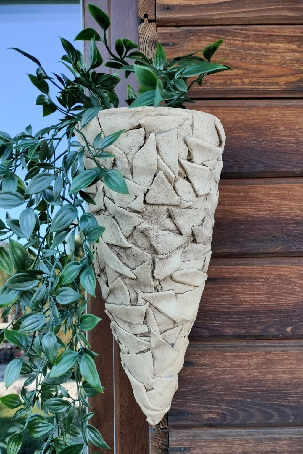 Popis: keramický závěsný "polokužel" na stěnu - výrobek nevidomých - krásná dekorace do zahrady, na terasu...