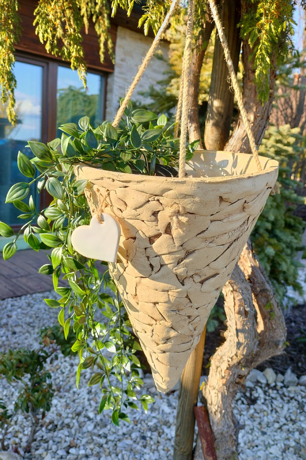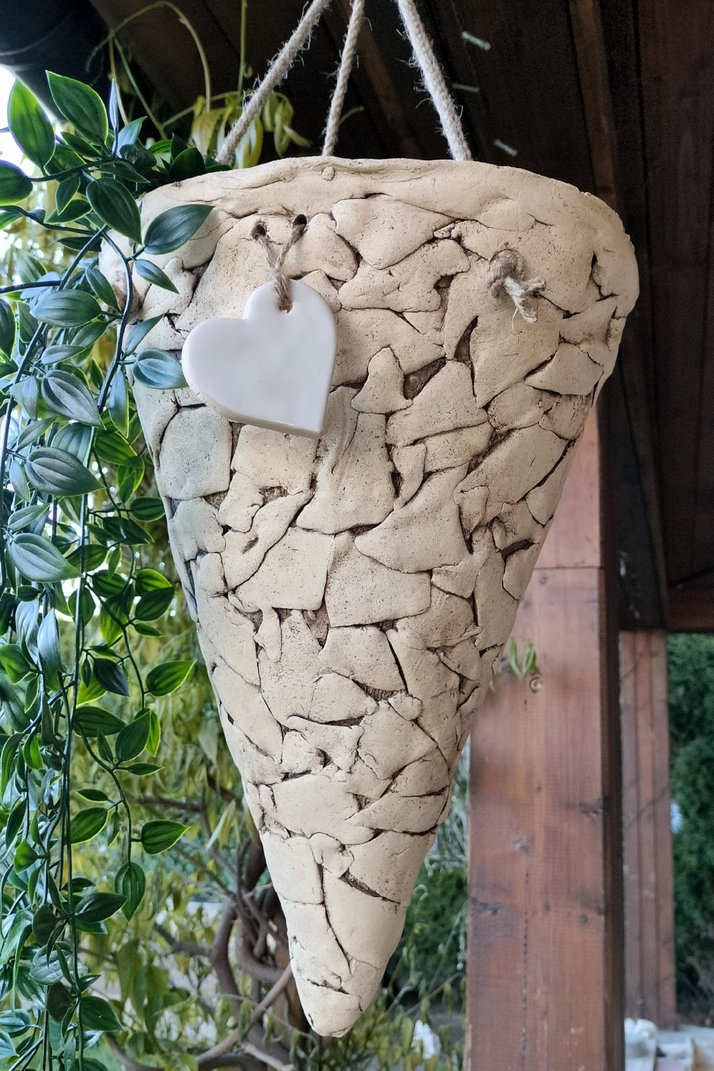 Popis: keramický závěsný kužel s bílým srdíčkem - výrobek nevidomých - krásná dekorace do zahrady, na terasu...